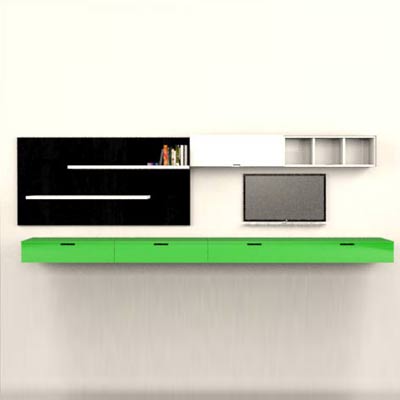 This TV Unit Design features white storage shelves, a contrasting black back-drop and green wall mounted base units. Ideal for those that prefer the more minimal look, without too many frills. Straight lines with clean geometric shapes - this Entertainment Unit illustrates the simplified form.