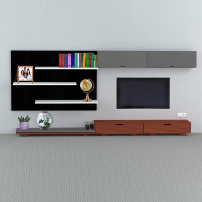 This TV Unit features clean, straight lines and natural or neutral colours. The symmetrical design gives one an illusion of space. This Entertainment Unit uses minimum textures, the wood finish bottom units offset the top lacquered shelves and grey unit. If you like this style, but want to add your own touch to it - you can customize it to suit your style by going to our app.